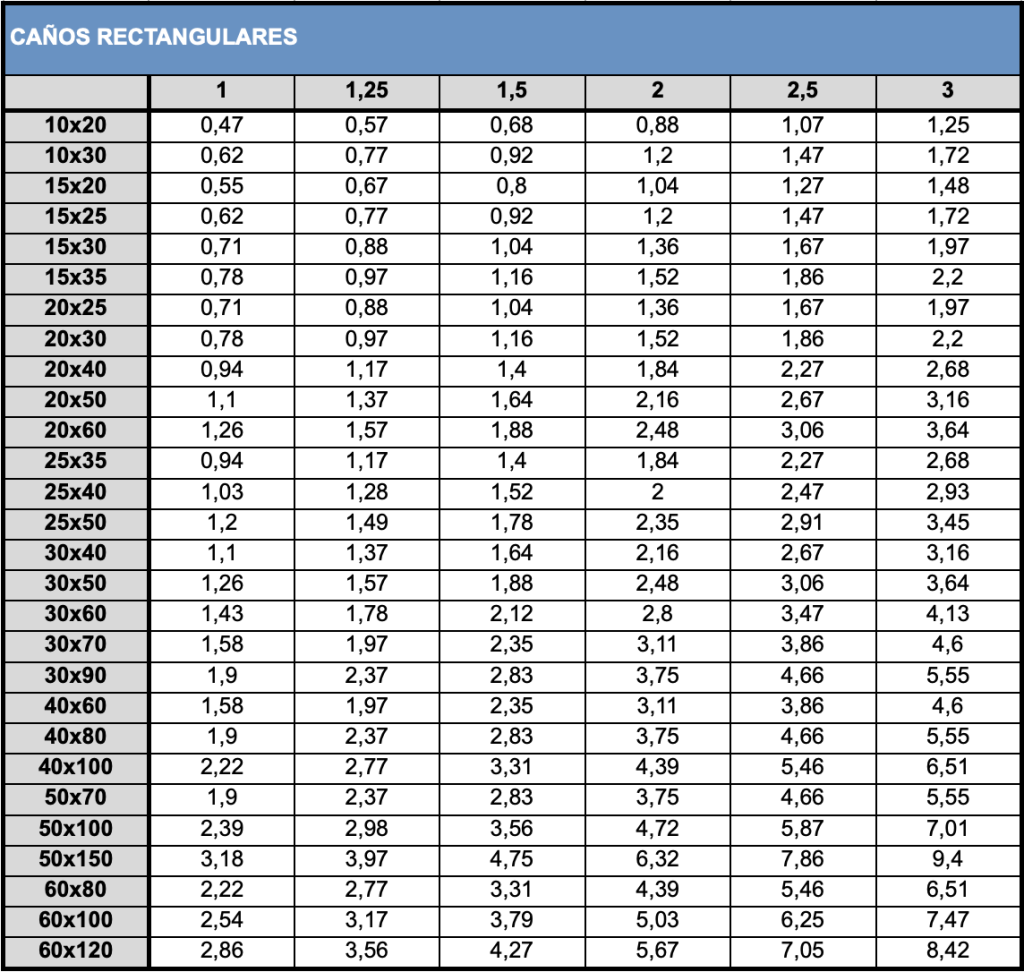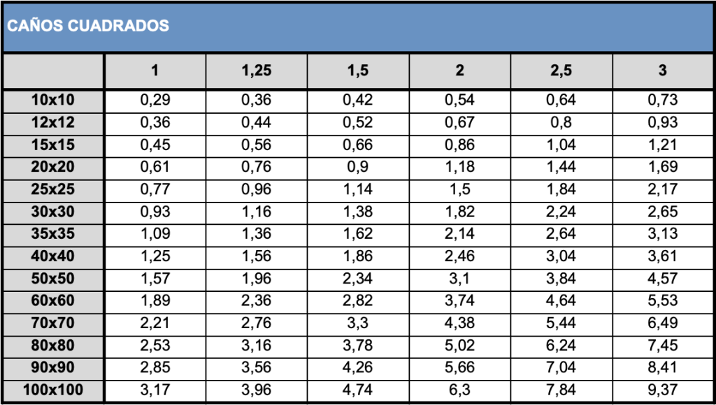 Tabla de productos A continuación ponemos a disposición la tabla de pesos en Kg x Metro aproximado. Productos Largos – Caños estructurales