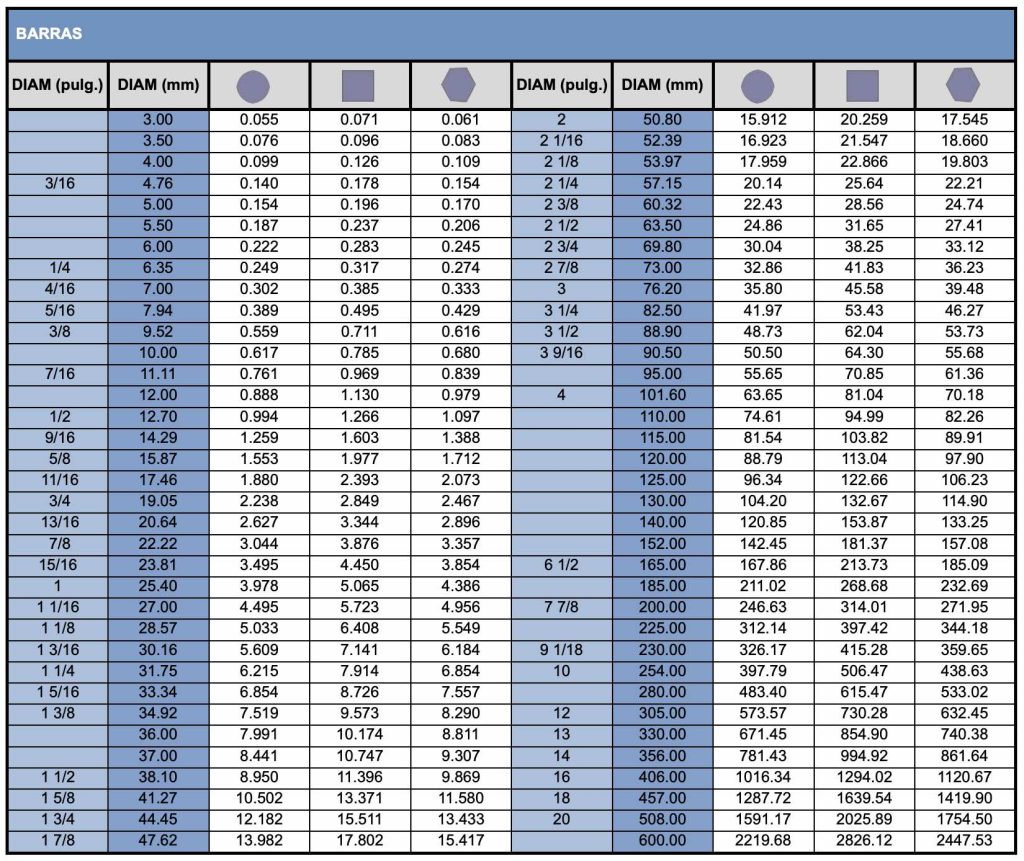 Tabla de productos A continuación ponemos a disposición la tabla de pesos en Kg x Metro aproximado. Productos Largos – Barras